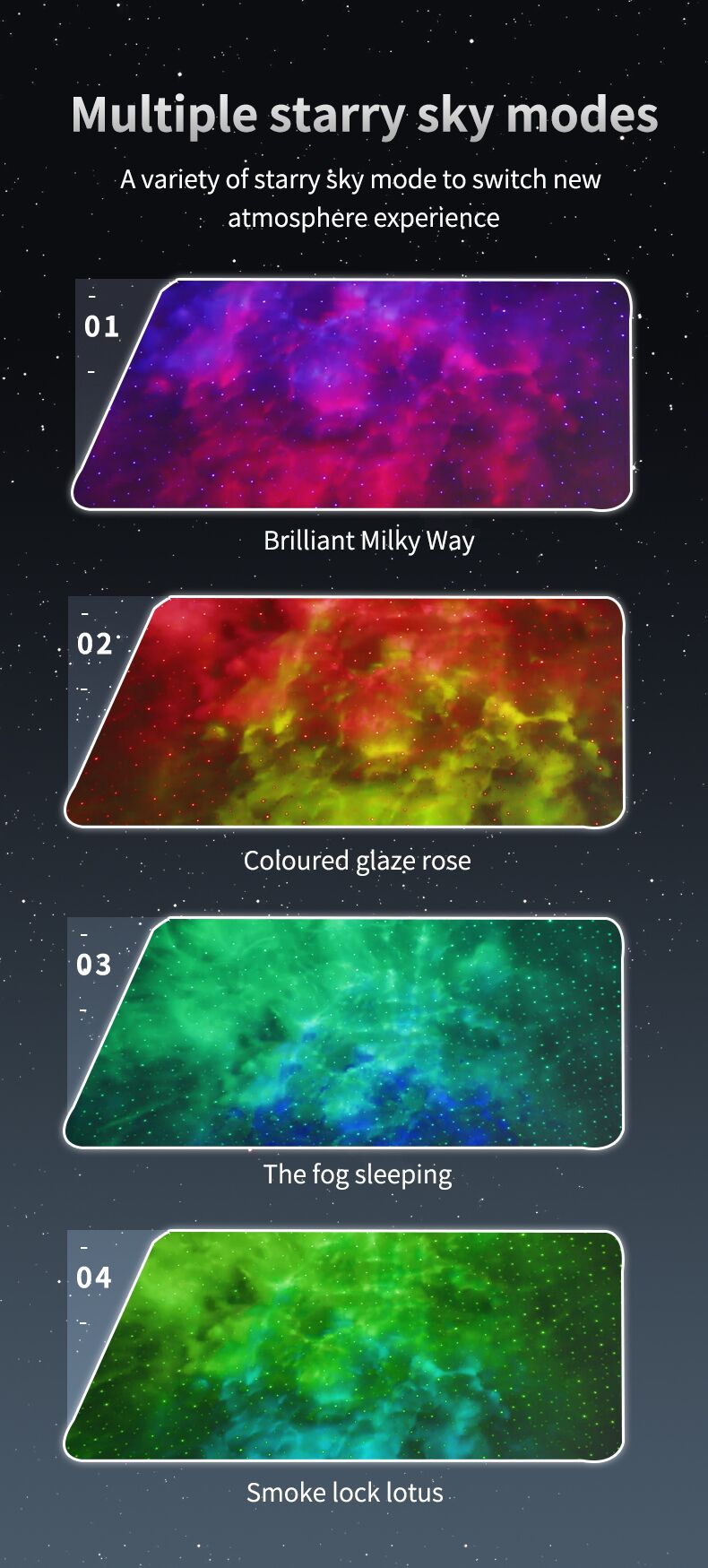 Du kan endda indstille din stjernehimmelprojektor til at ændre lysets hastighed og blinkenes rytme, så den passer til dig og lysstyrken.