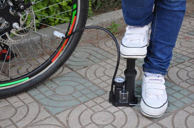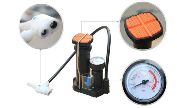 Stabiliteten under brug understøttes af de orange-trædede fodplader, som giver et godt greb på forskellige overflader, fra asfalt til grus. Dette design gør det muligt at pumpe dæk op uden at pumpen glider eller vælter under brug. Pumpens konstruktion er designet til at modstå regelmæssig brug under forskellige vejrforhold.