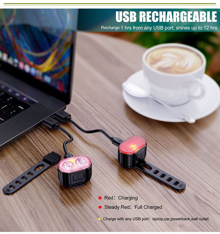 Vores For- og bag LED cykel lygte sæt 078 bestående af LED forlygte og baglygte hvor begge er ovale med en længde på 45mm og bredde på 28 mm – et sæt som ikke fylder meget og kan monteres på din cykel på mange måder. Begge lygter kan oplades med USB.