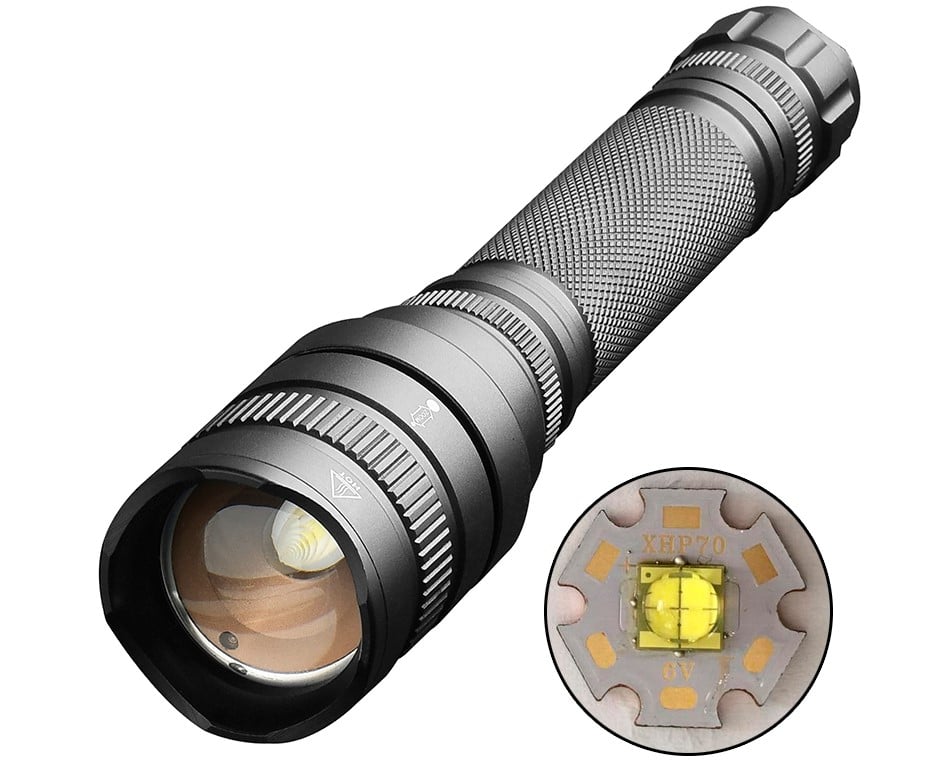 LED lommelygte XHP70 lyser op til 500m – med denne i hånden kan du lyse selv den midterste genstand op på lang, lang afstand. Det er bestemt en af