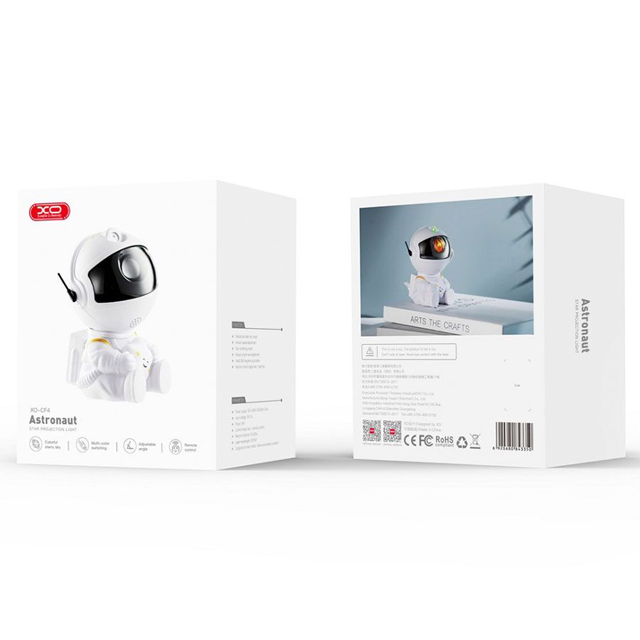 XO CF4 Astronaut stjerne LED lampe til børneværelset med projektor og fjernbetjening til styring af lysstyrke og hastighed, farve og lystid. Astronautens sidder ned og er ikke mere end 13 cm høj, så den fylder ikke meget. Hoved er fastgjort med magneter, så projektorens retning nemt kan justeres efter ønske. Fyld rummet med en galakse af stjerner og farver projiceret fra en sød lille astronautfigur med en indbygget timer – skab et univers af flerfarvet stjernelys.